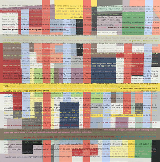 I’ve been working on this series over the last two years. In the process, I’ve discovered some really revealing studies about family business wealth. The series fuses topical tips on how to run your SFO effectively, as well as academic discourse on family conflict resolution and contested inheritance. It’s the interplay between these dynamics that I find fascinating. As with my previous AAAD series, I research and gather numerous references to my subject from experts and commentators across the globe. I then assemble the most varied and telling verbatim texts to narrate the story in bright, colourful, themed paintings. "This relatively unknown form of organization – the "family office" – may prove to be one of the more important means available to wealthy families for maintaining their social and economic position in society.”