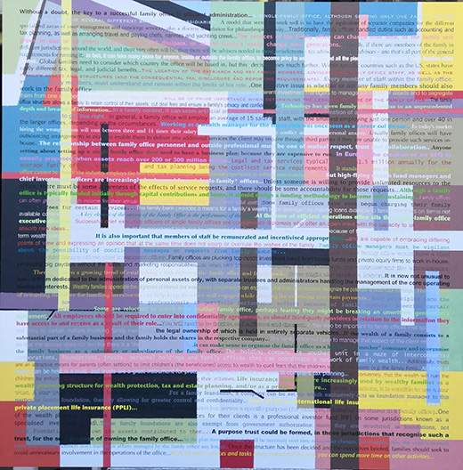 Single Family Offices are complex. In fact, each office has its own polity and agenda, but there are structural commonalities. The question of whether to outsource certain functions, due to cost factors or the need for certain expertise, should be viewed and reviewed in relation to the changing fortunes and circumstances of the family. People, both in finance and in art, have often asked me how the pieces are made. So, here is a little technical information about the process I adopt for my AAAD paintings… Each painting is on a gesso-primed board measuring 105cm x 105cm. For this new series, all the paintings have a background design that suggests an architectural drawing of an office, over which the text is laid. “I am often struck by how overwhelmed families are by the complexity and sense of burden that comes with managing wealth across generations.” These texts, their typefaces and layouts are designed on a computer in my studio, and then taken to a specialist stencil-maker. When the stencil is placed on the prepared board, the letters are exposed for the text to be spray-painted, all the other parts being masked off. In this way, I progress down the board, selecting and blending the colours for the texts according to the content of the wording, the underlying background and overall aesthetic I am looking for. Each individual quotation has its own typeface and colour. To borrow a term from finance, every word is positioned, coloured and shaped so as to gain maximum leverage for my chosen subject. “The judiciary in the low-tax jurisdictions that one typically works in are, generally speaking, very alive to the need to make these structures work, so there are considerable opportunities there.” During the research phase of Single Family Office, I contacted a number of specialists in behavioural economics and taxation planning, and psychotherapists who work with the ultra-wealthy. I am grateful to a number of them for bringing certain published, as well as their own about-to-be-published, articles to my attention. “Large single family offices with liquid assets may wish to appoint different investment managers to manage each pool of assets and to segregate them from one another in a structure which they control.” “Lenders are exploring the possibility of securitizing art loans as a way to lower the financial risk of carrying art on their balance sheet. Securitization could take the form of Art Collateralized Debt Obligations (ACDO) or an Art Credit-Default-Swap (ACDS)...” Art as a Derivative V – Single Family Office will be a comprehensive analysis of this worldwide and rapidly expanding aspect of private wealth management: a unique study, with a unique place in the contemporary art landscape.