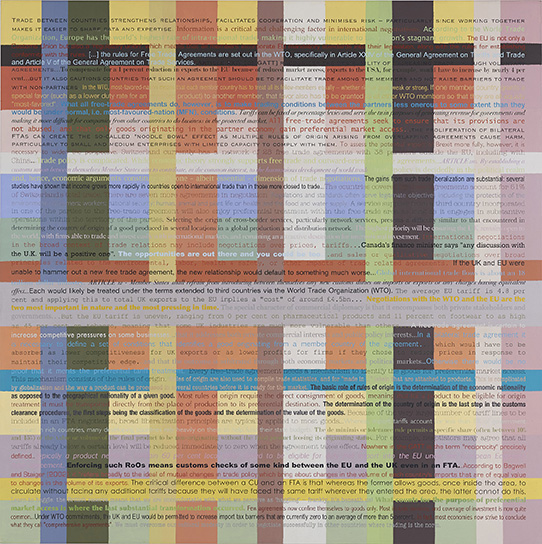 At a time in the global economic cycle when many countries are keen to protect their own economies, it is all too easy to lose sight of how important it is to remain internationally focused with regard to trade. In the giddy, non-stop, multi-channel news cycle, Art as a Derivative makes art through a paradox – by holding up the essence of the most challenging issues of our time and turning them into a form of 21st-century hieroglyphics. ...Weaker parties therefore face a dual challenge: they must both advance their interests in the rule-making negotiations and also increase the security of agreements. Art as a Derivative has a proven track record in anticipating economic and political trends. And perhaps international trade policy is the sphere, right now, that impacts the global population more than any other; here the artist can play a vital role. Don't do something in the short run that will come back to hurt you in the long run, that's not smart negotiation... The Art of Trade Negotiation required a research process in which tens of thousands of lines of verbatim text were read and sifted. Texts originating from diplomatic sources, global trade negotiators, academic conferences, leading legal and constitutional opinion as well as financial journalists and deal-making gurus were compiled. In a strict sense every free-trade agreement under which tariffs are eliminated over several years is an interim agreement... In one very real sense, the words themselves, their tone and stance, became my palette. I identified eight key themes that will be essential in reshaping the UK's relationship with the EU and will, in a wider sense, say much about the national self-image negotiators are aiming to present to the world. Understanding the purpose of trade agreements has immediate implications for how trade negotiations are conducted... Art as a Derivative IV – The Art of Trade Negotiation is unique: it combines a highly analytical approach to the negotiating process, whilst remembering that the critical importance of these talks will not protect them from becoming mired in the detail and legal code that is particular to formal free trade agreements. ...Always cooperate, until provoked; if provoked, always retaliate with equal force; be quick to forgive. In short, the whole thing could become so turgid that anyone not involved with or directly implicated in the talks could lose interest; and this in turn could have a serious impact on outcomes. How confidential is the information you are sharing? As a general rule, openness within government circles is important, but obviously details of negotiating strategies should not be available for all to see... Each of the eight 1-metre-square paintings explores a different aspect of the negotiating process in some 1,500 words of verbatim text. These texts are crafted into "dialogues" where opinion, past experience, rules and regulations and headlines meet and connect over a grid of intersecting brightly coloured columns.