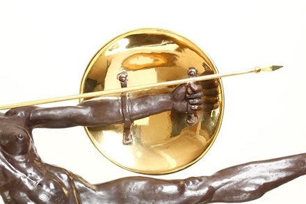 SCULPTURE Richard has created a supreme female athlete with a body reflecting physical excellence, capable of throwing her long heavy golden spear further and with more power than any man. Yet she is beautiful, graceful, feminine and extremely erotic. Her outstretched left leg is the leg of the most beautiful ballet dancer. Notice the delicacy of the way her breasts are curved, with such gentleness in the curves flowing out to the nipples, the firm flesh below the breasts swelling slightly around her muscular belly and then curving back into the pubic area. Her long legs, starting with firm perfect thighs, reflect the perfection of her legs. Note her beautiful back and luscious firm buttocks. The patination of the bronze is in Classic Rodin Style: first, a rich brown undercoating and then a black overcoating, so when the light dances on the sculpture the brown undercoating shows through. The gold shield, spear and helmet (which is cast in brass and then highly polished) gives a wonderful contrast to the rich patination of the bronze figure. Richard Minns