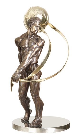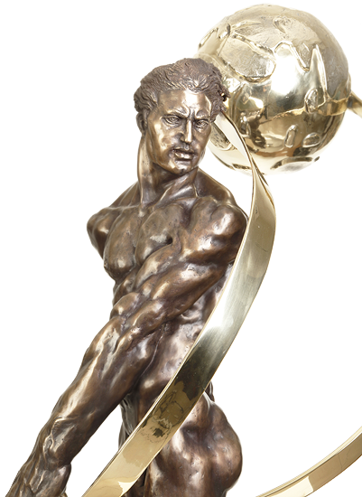 SCULPTURE In the first sculpture in the series, ATLAS SHRUGGED I: “ESCAPE TO FREEDOM”, Atlas has literally smashed his way out of the suffocating world of Collectivism, escaping to Freedom, in order to create his own perfect World (now appropriately depicted in Gold instead of Silver), a world conceived in freedom of individual rights and embodied in laissez faire Capitalism. In this, the second sculpture in the series, “ATLAS SHRUGGED II – GENESIS: A NEW GOLDEN WORLD OF INDIVIDUALISM”, Atlas has achieved his goal. He has created his own perfect world, conceived in freedom of individual rights and embodied in laissez faire Capitalism. The new golden world is now rising in the air on its own power, no longer requiring Atlas to struggle with the weight of the World on his shoulders. The new world supports itself. Atlas stands strong, pensive, reflective, poised for action. An indomitable man of purpose. Ready to forge his own individual destiny. This sculpture has been rightfully called very Rodinesque, and it is obvious that Richard was greatly influenced by Auguste Rodin, as well as by Michelangelo. Note Atlas’ dropped shoulder and extended left arm, with dramatic expressive fingers which were obviously influenced by Rodin’s “Adam” and the magnificent hands and expressive fingers of Pierre de Wissant in Rodin’s “Burghers of Calais”. You will also see the influence of Michelangelo where Richard was influenced by the Old Master’s “David”, his powerful “Day” in the Medici Chapel and the Old Masters’ “Victory” in the Palazzo Vecchio, Florence. Atlas is in bronze, with a classic rich dark brown patination. The world, and the straps holding the world, are polished Brass, reflecting a brilliant gold when the light dances on it. The circular base is polished Stainless Steel, reflecting a mirror double image of the sculpture. A turntable is hidden inside the base so the sculpture can be rotated around 360º with ease.