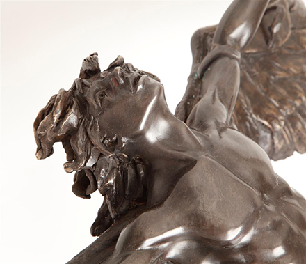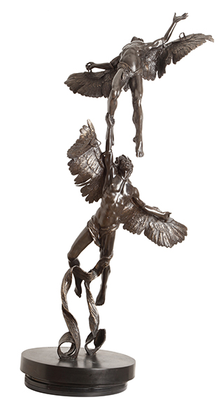 SCULPTURE’S DESCRIPTION Icarus is at the top, exhilarated with his ability to fly, and he is flying straight for the sun … and his doom. His father, Daedalus, is flying safely below, right arm outstretched high, holding his son’s ankle, attempting (in vain) to restrain him. Actually, Flying Too High (Daedalus and Icarus), where Icarus is flying straight for the sun and his father Daedalus is frantically trying to restrain him, is a companion sculpture to Icarus’ Final Moment, where Icarus (in mid-air), is about to crash into the sea, his body contorted in perfect Greek Pathos, his melted wings hanging limply under him. This sculpture is first a masterpiece in engineering and architecture. In order to show Dadealus and Icarus soaring high in the air and to create the illusion of defying gravity, Daedalus is flying in one direction and Icarus is flying in the opposite direction, creating a horizontal “V” shape so that the center of gravity is perpendicular to the center of the two bodies allowing the sculpture to stand solid and firm, but clearly giving the illusion of defying gravity … and FLIGHT! The relationship of the bodies of Daedalus and Icarus has maximum grace and fluidity of form, expressing power, emotion, conflict and maximum movement. It is a beautiful ballet of forms in the air. The expression on Daedalus’ face, anguish and concern over the fate of his disobedient son, is in contrast to the expression on Icarus’ face, exhilaration and rapture in his freedom of being able to fly. This is the original prodigal son story. The surface modeling is vintage Richard Minns at his best. No detail is overlooked … from Daedalus’ windblown hair … to Icarus’ wild hair covering his left eye … to every feather on their wings … to the stirrups which hold the wings to their arms. Nothing misses Richard’s watchful eyes. This sculpture LIVES! ARTIST’S