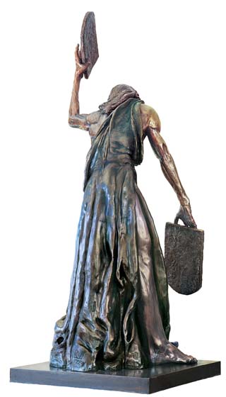 “MOSES did survive and when he arrived, barefoot, with his clothes in shreds, half-starved, but exhilarated, with the two Commandment Tablets from G-d, he was horrified at the above sight. He was betrayed. G-d was betrayed. The once-coveted Tablets become burning red-hot coals in his hands. He can't bear to hold them any longer. Tired, but overwhelmed with the shock of betrayal, my outraged MOSES is throwing the Commandment Tablets to the ground. His right arm has swung down. The tablet has left his outstretched hand, and I have tried to convey the impression that the tablet is in the air, falling. MOSES left arm is raised over his head preparing to hurl down the second tablet.