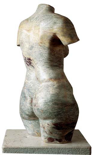 Richard's sculpture of Delilah, another Venus d'Milo-style torso, could be mistaken for the work of a Renaissance Old Master. Carved out of beautiful marble, the sculpture displays the magnificent polished texture of this remarkable piece of stone, while the Classical Renaissance beauty of Delilah springs forth. Every line in her body is a delight to see: her petite, but full, breasts, and her rounded stomach. However, as you walk around this sculpture it is Delilah's rear view that is especially stunning. This is truly a temptress who conquered the strongest man in the world.