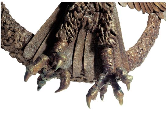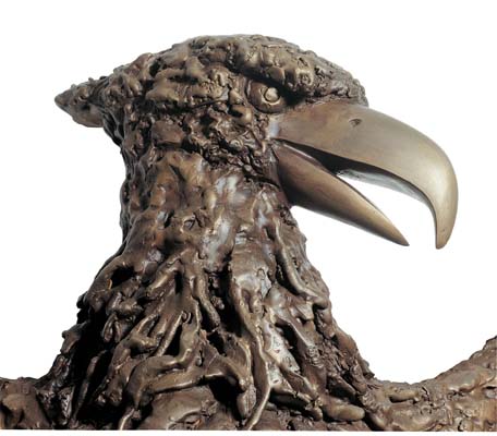Artist's Interpretation: “I formed the original sculpture 100% in wax and was able to produce some unusual effects, which one cannot achieve in clay or other media. For example, for the large wing and tail feathers, I poured out sheets of molten wax, then I hand-carved every single feather, carving each rib in each feather. After which I carefully sculpted them together. There are over 80 individual feathers. I let the wax melt and run when I sculpted the legs, talons and the neck feathers, to achieve a very impressionistic effect.” Richard Minns |