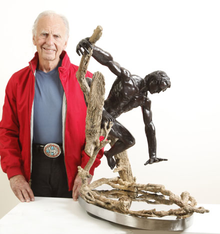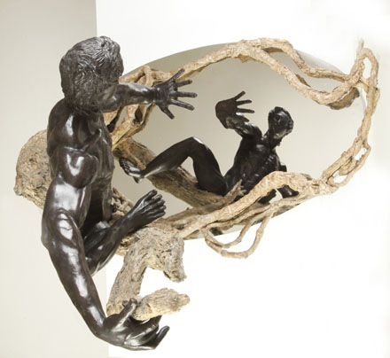 DESCRIPTION OF SCULPTURE 1. Psychology. Origin of the term “Narcissism”, a fixation with oneself. 2. Art. The myth of Narcissus has inspired artists for at least two thousand years, even before the Roman poet Ovid featured a version in Book III of his “Metamorphoses”. 3. Literature – Too numerous to list. Includes Oscar Wilde’s “The Picture of Dorian Gray”, Herman Melville’s “Moby Dick” and William Faulkner’s character “Narcissa” in “Sanctuary”. Richard’s Narcissus is an anatomically perfect youth, athletic, physically beautiful. But, as Richard says: “more of an Apollo than a Hercules”, inspired by Michelangelo’s “David” and Rodin’s “Adam”. Narcissus’ outstretched long fingers are a bit of an inspiration of Egon Schiele. Narcissus is modeled in Rodin-style, and the patination is strictly Rodin, with a brown undercoating first baked into the metal and then covered by a rich black so when the light dances on Narcissus, the brown undercoating shines through subtly, but brilliantly. The tree and supporting vines which circle the lake is a combination of Richard’s unique skills and Mother Nature. Richard went on a hunting expedition in the forest to find the tree limbs and the vines with the exact texture he wanted. Then he made a mold of the tree limbs and the vines and turned them into a wax which he could bend and mold to meet the desired position and effect. A special patina made the bronze tree and vines come alive. The polished stainless steel base acts as a reflection pool, reflecting Narcissus’ face, body and outstretched hand. The only way the viewer can get a full view of Narcissus’ face is to look at his reflection of the pool below.Richard Minns