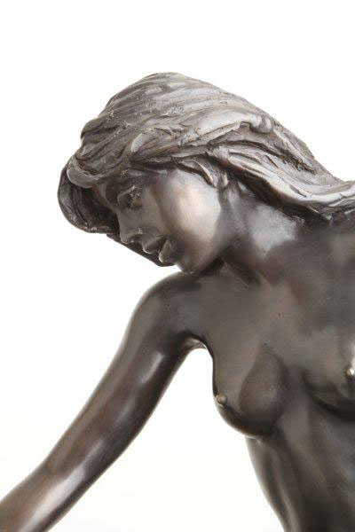 RICHARD L. MINNS Medium-size table top bronze. Classic potash rich dark brown patination on Pygmalion and Galatea. Black patination on Pygmalion’s sculptor’s tools. Special grey/white marble patination on ground and marble part of Galatea’s statue. 79 cm high x 54 cm long x 37cm wide, 31 in high x 21 in long x 15 in wide. CLASSICAL MYTHOLOGY As written in Ovid’s Metamorphosis, Pygmalion was a very handsome and very famous young sculptor in ancient Cyprus who wanted to marry and raise a family, but he could not find a woman who measured up to his standard of perfection. Therefore, he summoned all of his great skills and created the perfect woman out of a block of marble, then falling hopelessly in love with his creation. Pygmalion prayed to Aphrodite (Venus), the goddess of love, who gave the marble statue the gift of life. Pygmalion took his creation in his arms and since her fair skin was as white as milk, he named her Galatea, after the Greek word for milk. They had a son, Paphos, and the Cyprus city of Paphos bears his name to this day, preserving the story for all eternity. DESCRIPTION OF SCULPTURE The basic Pygmalion story has made its influence in literary / art / musical history more than any other Greek myth as each generation of artists, sculptors, writers, poets, playwrights, composers and musicians continue the Pygmalion concept in art, sculpture, literature, theatre, opera and cinema. First to come to mind is George Bernard Shaw’s award-winning play “Pygmalion”, which was turned into the award-winning stage and screen musical “My Fair Lady”, starring Rex Harrison as “Professor Higgins” and Audrey Hepburn as “Eliza Doolittle”. The seemingly endless list of branches from the Pygmalion tree includes “Phantom of the Opera”, “Educating Rita”, Nathaniel Hawthorne’s “The Birth-Mark”, Oscar Wilde’s “The Picture of Dorian Gray”, “Pinocchio”, even Mary Shelley’s “Frankenstein” and even the Simpsons’ episode entitled “Pygmoelian”. Artists and sculptors who have given their interpretation of Pygmalion include Auguste Rodin, Francisco Goya, Honoré Daumier, Edward Burne-Jones, Paul Delvaux, among countless others. Richard now enters the classical ring with his interpretation. Richard’s Pygmalion, his sculptor’s chisel in one hand and hammer in the other, is kneeling before his marble creation of Galatea, making the final touches. He hears a movement and laughter above him and looks up to see to his surprise and delight that Venus (Aphrodite) has granted his prayers and his creation has come to life. Galatea, laughing, reaches out to her lover, touching his cheek. To effectively portray this metamorphosis, Galatea’s upper half (the part which has come alive) is in bronze (like Pygmalion), where the lower part of her legs is still in marble. To create contrast and drama, the ground is white marble, which stands out on the ivory black polished base. Pygmalion’s sculpture tools are scattered on the white marble ground. The tools are covered with a black patina, in stark contrast to the white ground. Pygmalion and the part of Galatea which has come alive has a classic potash rich dark brown patination to effectively portray Galatea’s metamorphosis. Now the beauty of this magnificent bronze and marble sculpture is that the sculpture is 100% bronze and there is no marble on it. The white marble block, which Galatea is breaking out of, and the white marble floor is not real marble. Richard can create a bronze sculpture which looks identical to marble. This is the beauty of having a patination master and Richard’s foundry has one of the best in the world. ARTIST’S INTERPRETATION “I am an ex-Journalism professor and a frustrated “Story Teller”. I get great pleasure writing stories and reading them, first to my children (now grown), then to my grandchildren (now grown), and presently to my great grandchildren.” “The purpose of my sculptures is to tell a story. If my sculpture needs to be explained to the viewer, then I have failed. My sculpture stories are about the heroes of the Bible and the heroes of classical mythology. (Of course, it helps if the viewer knows the story.)” “My interpretation of Pygmalion is a young, handsome sculptor with a pleasing trim athletic body, but certainly not a Hercules, Samson or an Achilles. Galatea is the perfect woman – or at least Pygmalion’s concept of the perfect woman for him. Slim, feminine, with large eyes and Angelina Jolie lips.” “By casting the entire sculpture in bronze and relying on my patination expert to simulate marble, I was able to show a mixture of classic potash and white patina slowly blending together on Galatea’s legs. Look close. I think you will like it.” “I could say more, but I will let me sculpture speak for me. If you feel I have effectively told the Pygmalion story, then I have succeeded.”Richard L. Minns