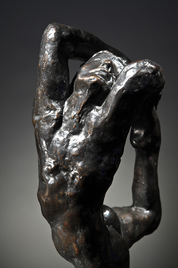 Far larger than the other figures in the series, "Dance Movement A" achieves a form which is both representational and abstract. Rodin has abandoned much of the anatomical precision which characterizes his earlier work. Instead he has treated the figure in a summary fashion so that he might capture its energy and emphasize the dynamic circular form achieved by the dancer as she reaches back with both hands to grasp her right foot. The clarity and energy of "Dance Movement A" finds a close affinity with the figures in Henri Matisse's dance pictures of 1910-1912.